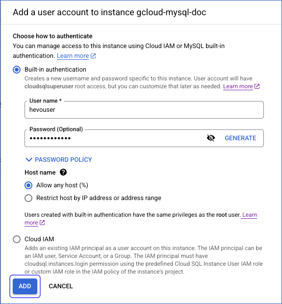 You can add a database user to your Google Cloud MySQL instance in one of the following ways: